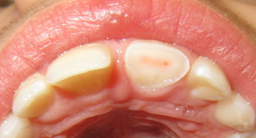 - Er en eller flere tænder knækkede, og kan der ses en rød plet/blødning midt på fladen, hvor tanden er knækket?