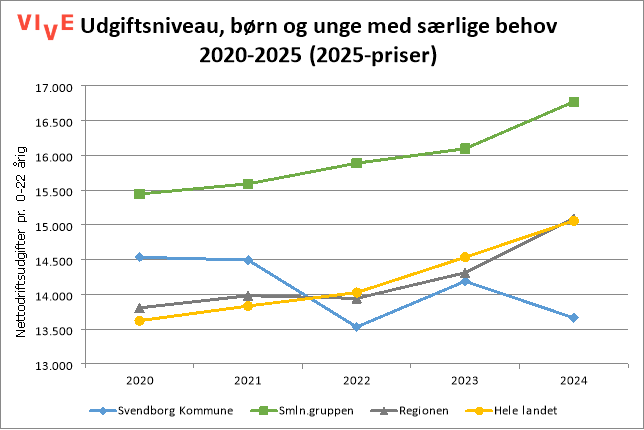 Det faldende antal anbragte giver sig udslag i udgiftsniveauet, hvor udgifterne opgjort pr. 0-22 årig nu er under sammenligningskommunerne, regionen og hele landet som helhed. Andelen af anbragte forventes ikke at fortsætte nedad, men at finde et mere stabilt niveau fra 2025 og frem, hvorefter udgiftsniveauet tilsvarende forventes at jævne sig ud de næste par år.