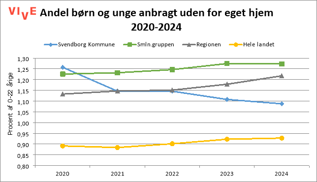 Antal anbragte opgjort af VIVE baserer sig på indberetninger til Danmarks Statistik og er et ”her og nu” billede af anbringelsestallet og matcher derfor ikke Svendborg Kommunes egne opgørelser, som tager udgangspunkt i antal helårsanbringelser samt kun de børn og unge Svendborg Kommune er betalingsforpligtede for, hvorimod der i ovenstående opgørelse er taget udgangspunkt i alle, hvor Svendborg Kommune er handleforpligtede. Alligevel giver det mening at bruge ovenstående ECO-nøgletal, da man derved får muligheden for at sammenligne Svendborg Kommune på tværs af sammenligningskommuner, regionen og hele landet.