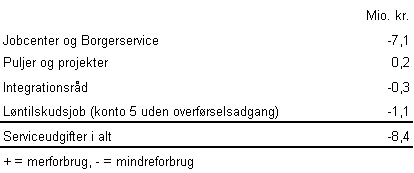 For serviceudgifterne udgør det forventede regnskab 83,4 mio. kr., hvilket svarer til et forventet mindreforbrug på 8,4 mio. kr. Afvigelsen pr. politikområde er følgende: