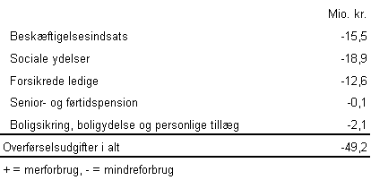 For overførselsudgifterne udgør det forventede regnskab 1.172,0 mio. kr., hvilket svarer til et forventet mindreforbrug på 49,2 mio. kr. Afvigelsen pr. politikområde er følgende: