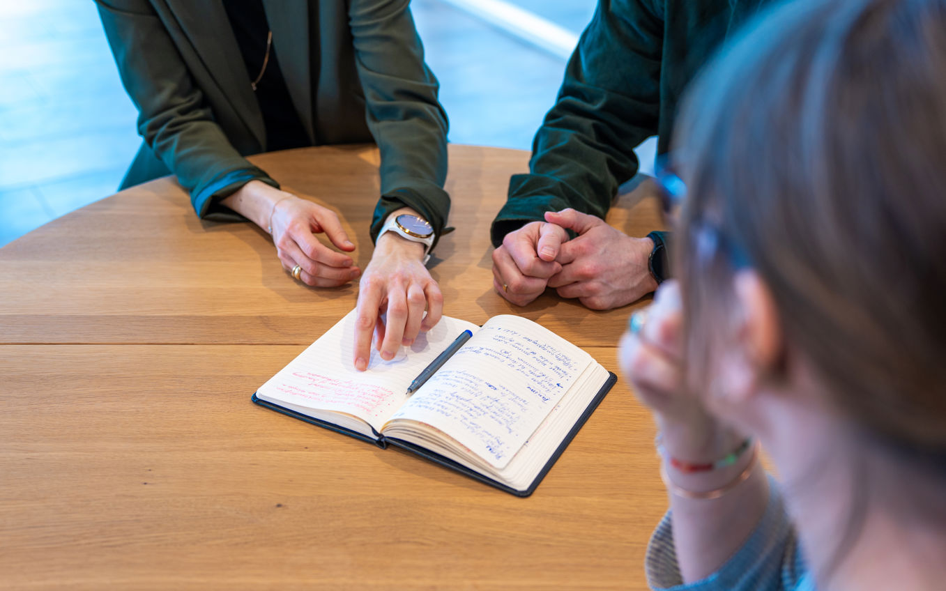 Tre personer der sidder ved et bord med en computer