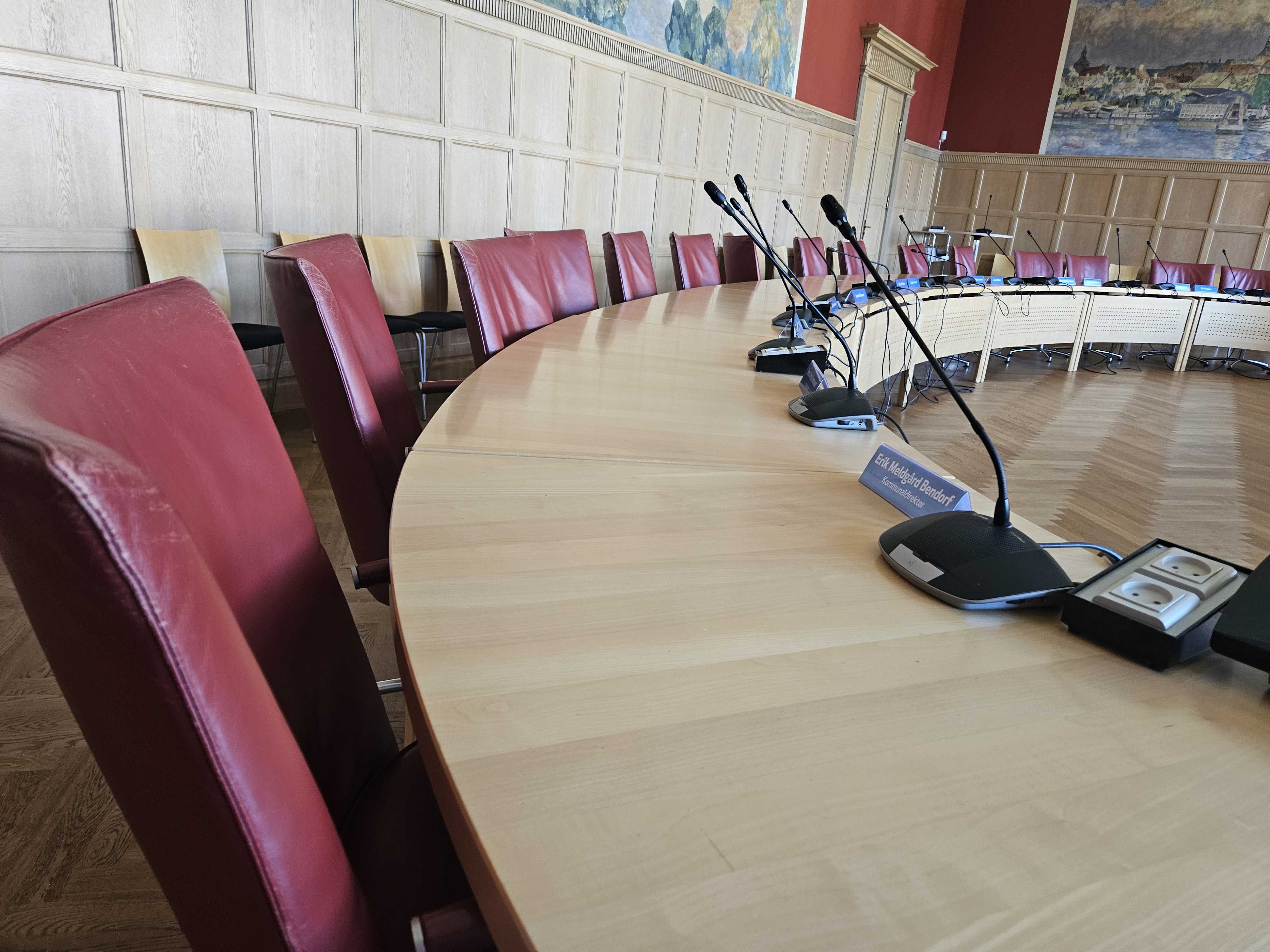 I dag er salen bygget op, så kommunalbestyrelsen sidder i en ellipse.