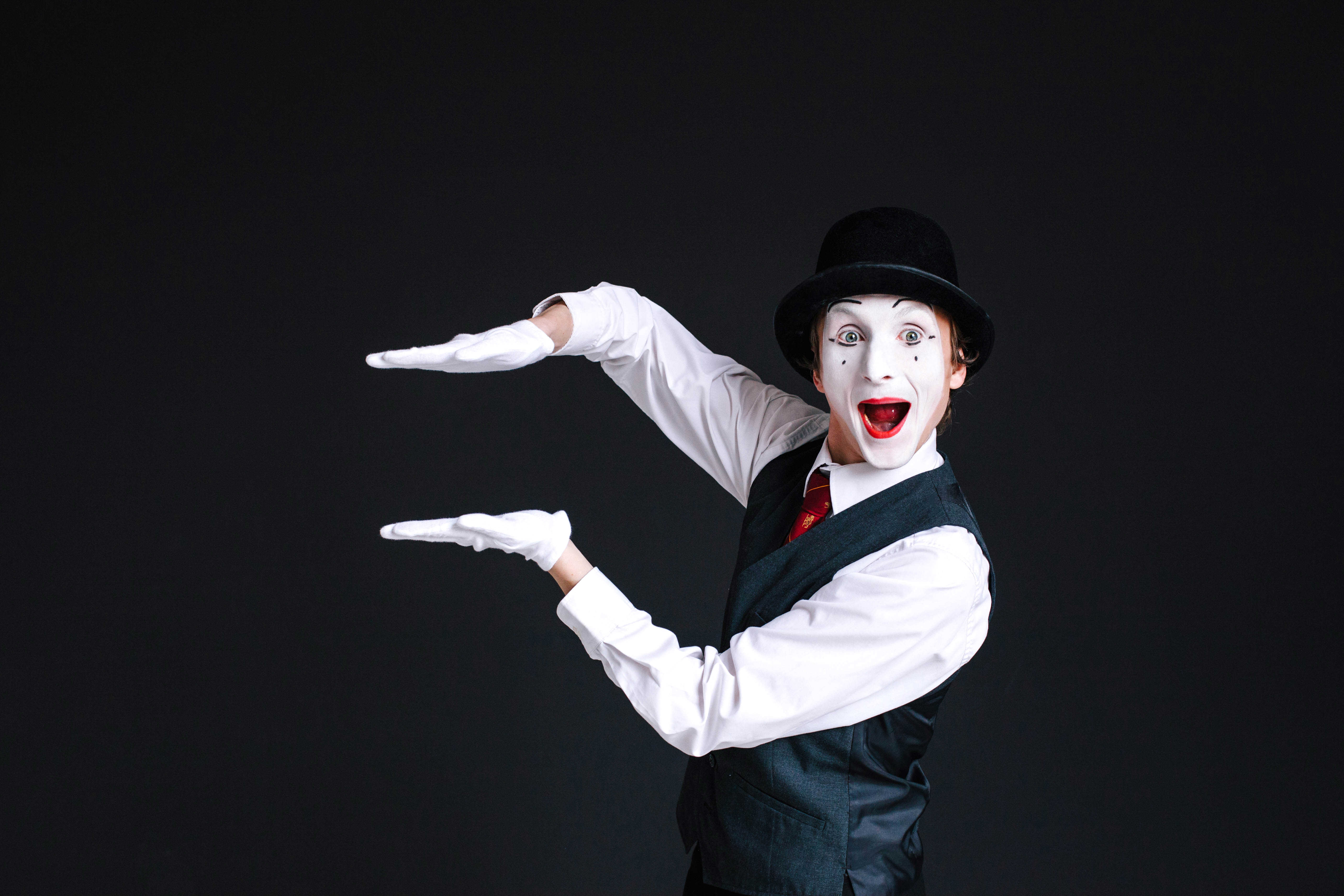 • 16.00–16.30: Mimeren overtager – med hvid sminke, striber og stilfuld tavshed